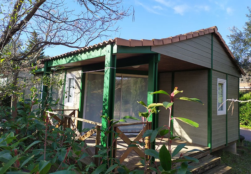 Chalet de 35 m², avec terrasse en bois couverte. Composé de 2 chambres séparées, il peut accueillir jusqu’à 7 personnes avec un grand lit en 140, 2 petits lits gigogne, un lit superposé de 80 et un canapé convertible.