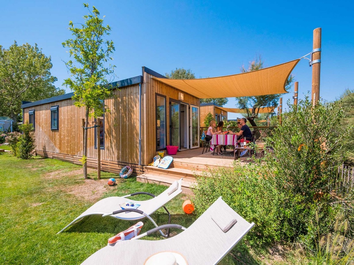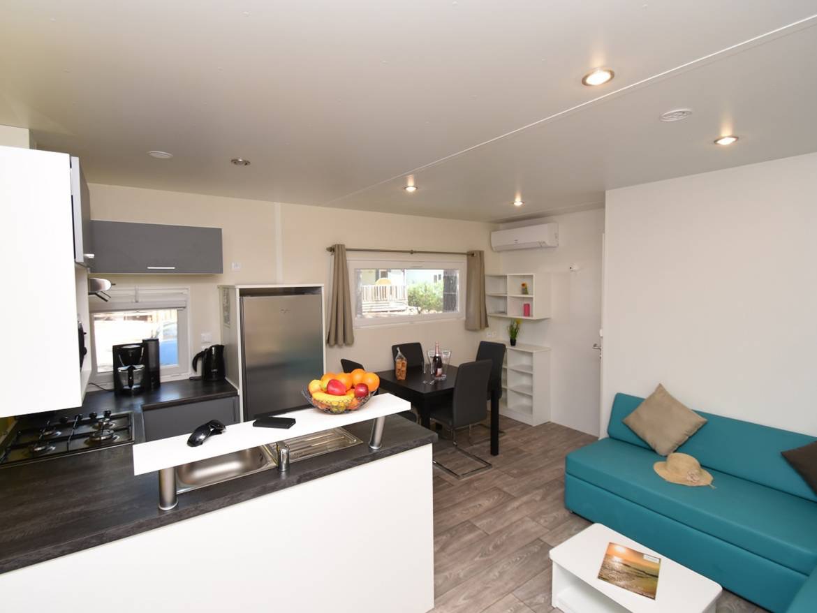 Mobil-homes 2 ou 3 chambres. Une grande terrasse couverte équipée d’une toutoubarrière pour profiter des belles journées. TV et cuisine équipée avec micro-ondes, cuisinière gaz, frigo congélateur, cafetière électrique (filtre), kit vaisselle, aspirateur et climatisation. Salle d’eau et WC séparé.